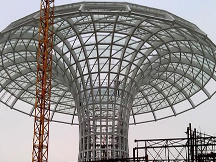 二、球形网架结构因其结构新颖,受力合理,自重轻、用钢量低等优点。如大型体育场馆球形吉首螺栓球网架、公共场馆球形网架、电厂吉首螺栓球网架、水泥工业球形网架、仓储物流球形网架、吉首干煤棚工业球形网架、吉首收费站吉首加油站球形网架、展览中心、影剧院、商场、航站楼、候车厅、工厂吉首车间、仓库、电视塔等球形螺栓球节点网架。国内球形网架结构主要分为:吉首焊接球节点网架及螺栓球节点网架两种。螺栓球节点网架其构件工厂内加工量较大,现场安装便捷,适用于现场工期紧,吉首施工条件、用电量受制约,网架形状复杂、吉首杆件定位困难的异形结构。螺栓球节点球形网架系统基本由吉首杆件、螺栓球、支撑支座等组成。按照节点形式可分为交叉吉首桁架体系、四角锥体系、三角锥体系等。支撑方式多为固定支座支撑。对于大面积、大跨度及有特殊受力或伸缩要求的网架结构可采用橡胶支座、滑移支座、球铰支座等支撑形式,以满足结构自身的受力稳定、均衡,便于内力释放等设计要求。